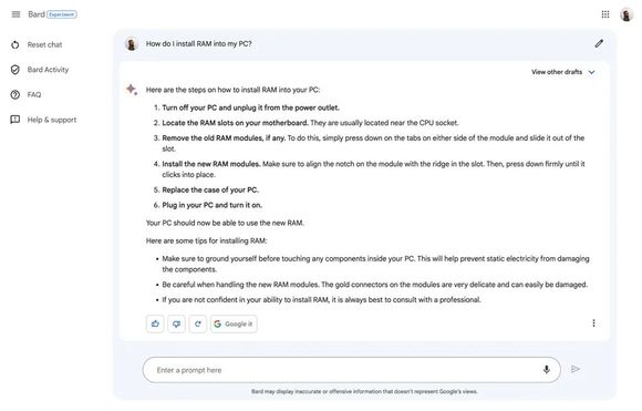 Bard列出了每一步的操作过程:“关闭电脑并拔下电源;找到主板上的RAM插槽;删除旧的RAM模块,模块两侧的标签,并将其滑出插槽;安装新的RAM模块,确保模块上的凹口与槽脊对齐,然后按下去,直到听到咔嗒一声;插上电脑电源,然后开机启动。”