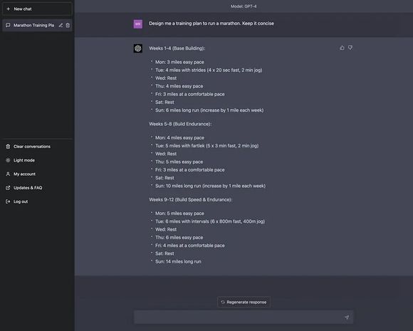 ChatGPT详细列出一个完整的训练时间表,并建议跑步者的速度与平时训练时的速度相似,这份回答完全可以当作一份跑步训练模板来使用。