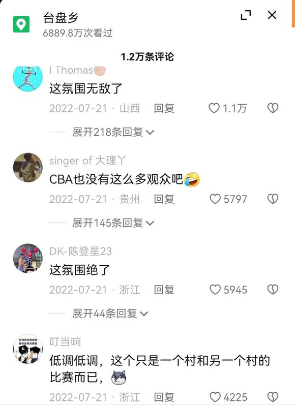 7月21日这段极富感染力的视频在上传之后迅速传播开来,浏览量达到了6000多万,大家纷纷在评论区纷纷留言:“这氛围绝了”“太牛啦接地气”“这是一个村级比赛?!”还有网友科普台盘村“村BA”现场:“从白天达到黑夜,黑夜打到白天!俗称黔东南篮球天亮文化。”