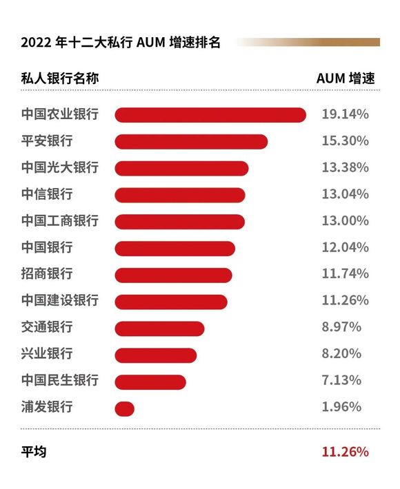 如下图所示,中国十二大私人银行2022年AUM增速排名前五的是中国农业银行私人银行、平安银行私人银行、中国光大银行私人银行、中信银行私人银行和中国工商银行私人银行。农行私人银行以19.14%的增长率排在首位。