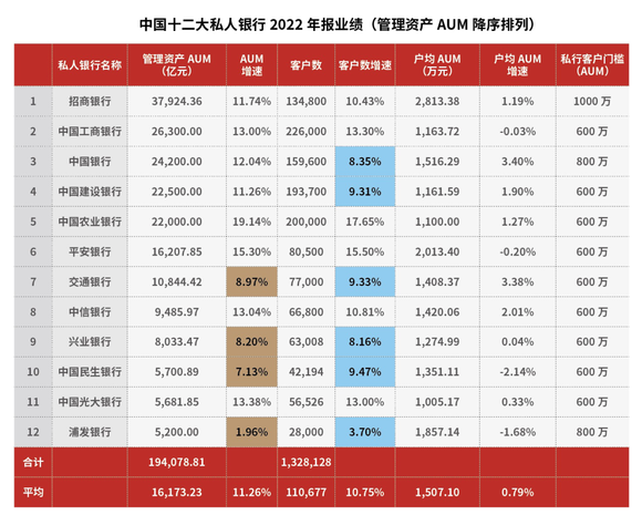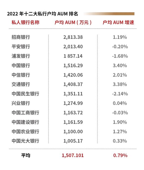 上图中用金色和蓝色突出显示的都是个位数的增长率,而往年则只有2-3家会有这种情况。同时还有部分私行户均AUM较2021年有所下降,增长率为负。