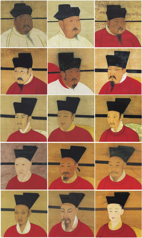为了契合这种帝王异相的想象,后世画家们所绘的秦皇汉武的画像,也都往往是胡须浓密,眼角细长,额头突起,鼻梁高挺。有些画像因为过于追求天子的非凡形象,不但与皇帝本人的真实相貌毫无关系,有时甚至扭曲夸张得都不似一张真实的人脸。于肖像画的写真而言,的确离题万里。相比于相由心生以及天生异相等神圣性的获取方式,皇帝相貌的真实性,在宋代以前似乎不太让人在意,肖与不肖,不在外表,而在圣心。即使有时候需要标榜真实,也是从心而不从相。传为唐初阎立本所作的《历代帝王图》,依靠高超的艺术造诣,再现了从汉到隋的十三位皇帝的风姿神采,画家依据历史上这些皇帝的行事与性情,创造了他们各自的相貌特点,使得他们的面容不但栩栩如生,更是在神似这个意义上高度展现了艺术的真实。不过,这种真实,仍然是一种抽象的真实,与宋代御容所追求的写真、写貌,大异其趣。