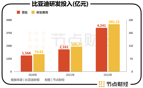 2020年-2022年,比亚迪的营收从1566亿元增长至4241亿元,三年翻了近三番;研发费用2020年为75亿左右,2021年增长43.6%至106.27亿元,2022年再度狂飙90.3%至202.23亿元。