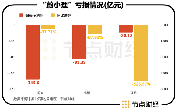 财报显示,轰轰烈地干了近十年,蔚来、小鹏、理想无一盈利,“失血窟窿”还有肿胀的迹象。2022年,三家公司分别亏损145.6亿元、91.39亿元、20.12亿元,同比扩大37.71%、87.92%、525.97%。