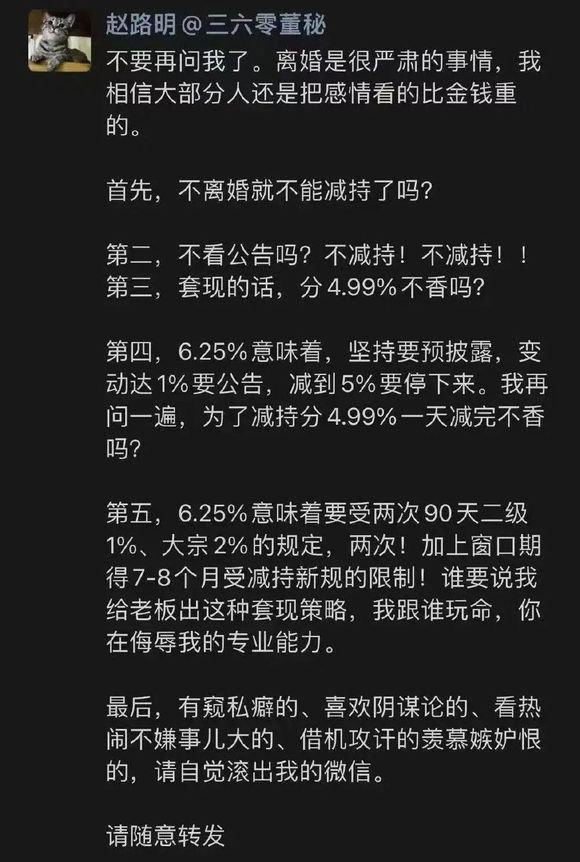 三六零董秘赵路明为此很恼火:有窥私癖的、喜欢阴谋论的、看热闹不嫌事儿大的、借机攻讦的羡慕嫉妒恨的,请自觉滚出我的微信。