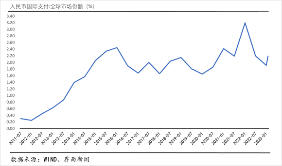 2021年12月,在SWIFT基于金额统计的全球支付货币排名中,人民币全球支付排名一度超越日元升至全球第四位,占比2.7%,但随后份额有所下滑。2023年2月,人民币仍为全球第五大支付货币,占比2.2%。