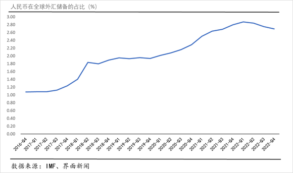 从2016年第四季度到2022年第四季度,人民币在全球外储中的占比从1.1%一路升至2.7%,升幅为1.6个百分点。同期,美元占比从65.4%降至58.4%,降幅为7个百分点;欧元占比从19.1%升至20.5%,升幅为1.4个百分点;日元占比从4.0%升至5.5%,升幅为1.5个百分点;英镑占比从4.4%提升至5.0%,升幅为0.6个百分点。