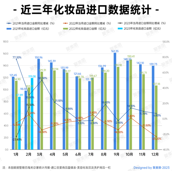 4、从最新披露的2023年1-2月的数据来看,化妆品出口金额为55.75亿元,同比增长13.1%;进口金额为206.97亿元,同比下跌5.1%,而在1月,进口金额就同比下跌了23.40%。
