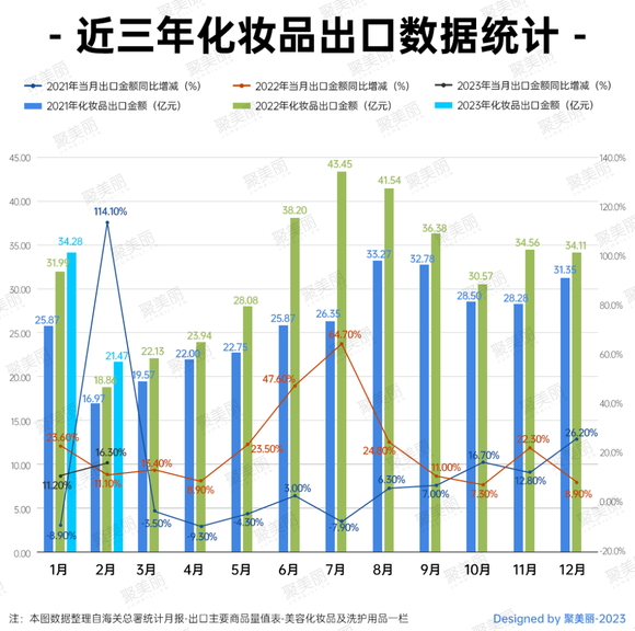 1、我国化妆品出口金额近两年基本处于增长趋势,仅2021年的个别月份出现同比下降。