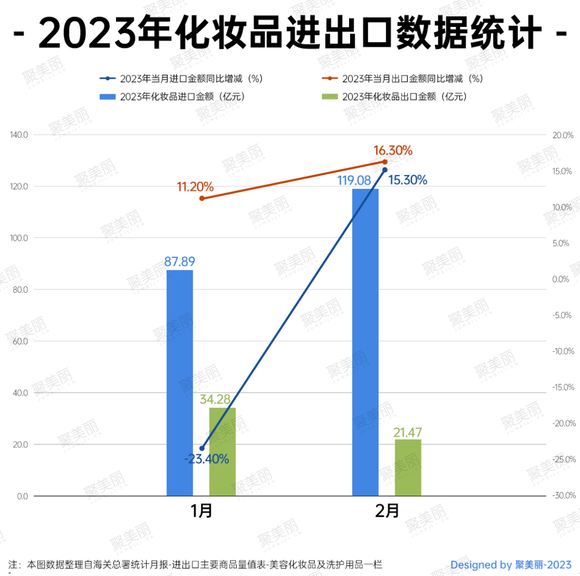 2021-2023年化妆品进出口更为详细的数据情况见下图: