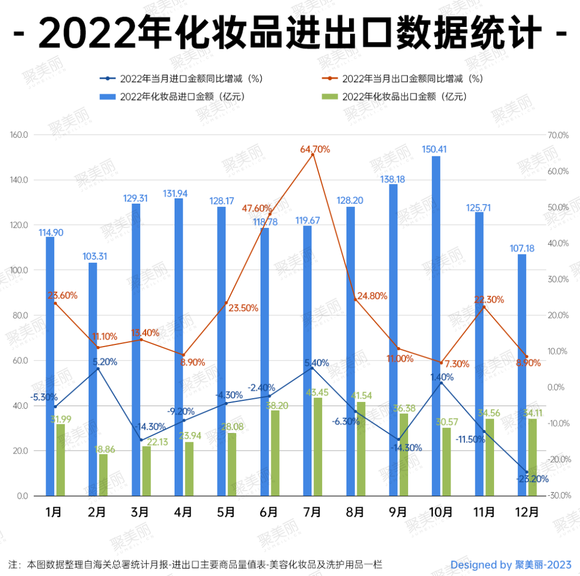 据中国海关的统计数据显示,2021年化妆品出口金额达313.51亿元,同比增长6.4%,进口金额为1612.96亿元,增长15.2%;2022年出口金额为376.52亿元,大幅增长20.1%,进口金额为1493.59亿元,同比下降7.3%。