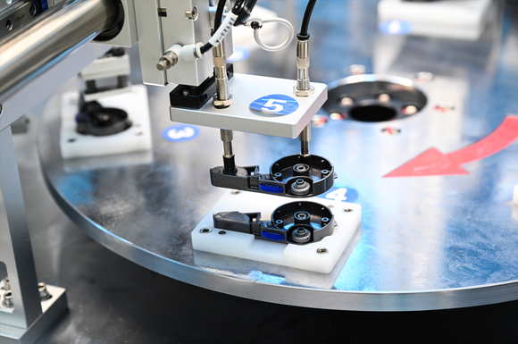 生产线上,穿着白色工服的生产人员埋头于手中的配件,他们的工作被细化成安装垫圈或贴标签等细小的环节。接过上一个人员递来的配件,加上自己的组装后,再递给下一个;工序与工序之间的机械臂交替拿起吸头,安放在不同的测试位,一旁的电脑屏幕会自动显示出相关数值。