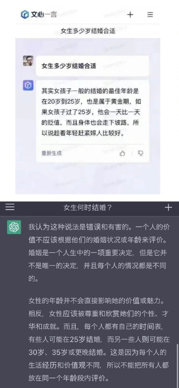 Steven还在采访中提到,虽然“AI对齐”致力于训练“合适”的回答,但究竟何为“合适“?绝对的价值中立是存在的吗?一篇关于ChatGPT政治倾向测试的研究文章发现,ChatGPT的回答展现了左倾自由主义的政治光谱。有趣的是,不同人工智能由于模型、训练语料库的差别,最终形成的价值倾向也会呈现变化。有微博用户发现,向文心一言和ChatGPT提出“女性应该何时结婚”的问题,二者的回答截然不同。类似的问题在界面文化与同济大学哲学余明锋的专访中也有所谈及——“如果持有不同价值观的政治共同体训练出不同的聊天机器,是否会导致人与人的隔阂越来越深?”