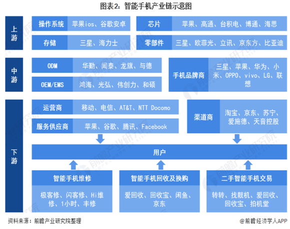产业链方面,智能手机环节复杂,角色参与者众多。包括中上游零部件(制造、芯片、显示屏、摄像头、电池、软件开发等)、下游整机和服务商(手机品牌商、运营商、渠道商、维修售后等),市场规模庞大且是全球化分工。即便最近几年终端出货量有所下降,仍是目前全球最为庞大、产值最高的产业链之一。