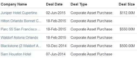 长久以来,黑石集团一直是全球酒店业影响最大的私募基金之一。2007年7月3日,黑石集团宣布将以260亿美元并购当时世界上最大的连锁酒店集团-希尔顿酒店集团,交易将以现金进行。260亿美元(含债务)的价格对应每股47.50美元,显著高于希尔顿前一日36.05美元的收盘价。