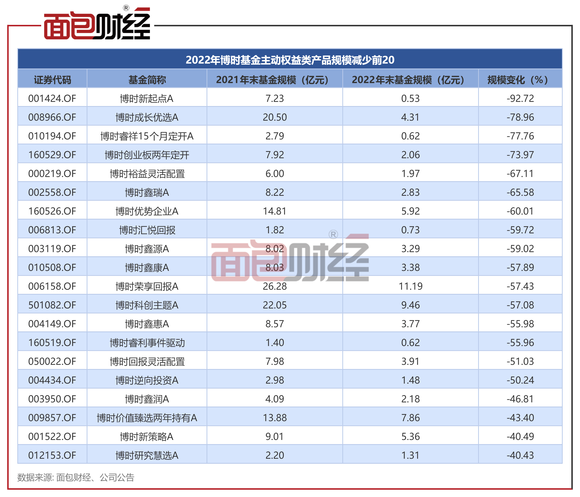或受业绩影响,博时基金旗下多只主动权益类产品在2022年基金规模减少超过50%。
