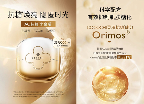 目前,针对上述抗初老的需求,就有国内外的品牌推出了系列的产品,以日本护肤品牌cocochi为例,一直专注专注于抗糖护肤研究,不仅联合日本抗糖化研究首席科研机构——同志大学糖化应激反应研究中心进行肌肤抗糖化研究,研发出品牌灵魂抗糖成分Orimos,抵御肌肤糖化率高达91%,强化补充胶原蛋白纤维网、清除自由基。同时,还与日本抗糖领域资深大学、实验室、医学专家深度合作,不断在成分和技术上寻求新的突破。