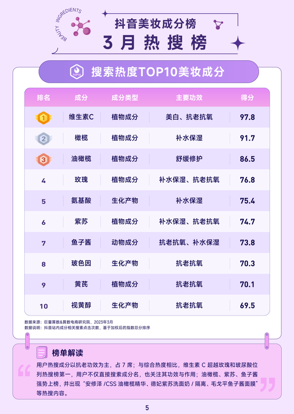 据巨量算数发布的《3月抖音美妆成分榜》中显示,3月抖音美妆综合热度TOP10的美妆成分,主要以抗老功效为主,占据5席,包含玫瑰、维生素C、视黄醇、艾叶和芦荟。