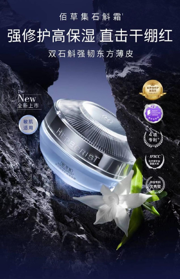 佰草集,有着专门的草本研究所和完整的草本数据库。而石斛霜,则是其在2022年推出的新系列产品,核心成分是双石斛修护保湿因子,主打的双石斛中金钗石斛又叫“千年润”,主要强调保湿锁水。据悉,铁皮石斛不仅稀缺还富含多糖,修护效果强大。两者结合修护力高于依克多因1.2倍,保湿力优于 5重玻尿酸1.7倍。
