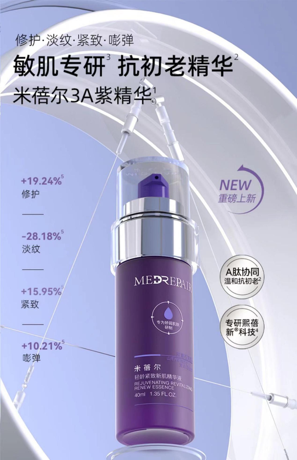 米蓓尔3A紫精华,就摒弃了传统的A醇,用3A[HPR+植物 A醇+A酯]的搭配来实现 A醇达不到的温和抗老效果。防护力更高,能预防各种抗老刺激,减少纹路产生。双肽成分,协同主动抗老出击激活胶原,增强基底膜。山毛榉紧致因子实现 3A+2肽+1糖井进的多维温和抗老,自研了一个熙蓓新包裹技术,让 3A更温和地释放融肤。并在依克多因&多重玻尿酸的内修护外防御上配套了悦肤宁+积雪草+黑玫瑰提取2发酵+3植萃为敏皮做到了多方面的防护。② 干皮,干皮天生出油少,皮脂膜不太完整,经常容易感到干燥,干皮的真皮层和表皮层都比油皮薄,真皮层越薄,支撑力越差,这样外界刺激包括紫外线就更容易到达真皮层,也就更容易产生细纹。