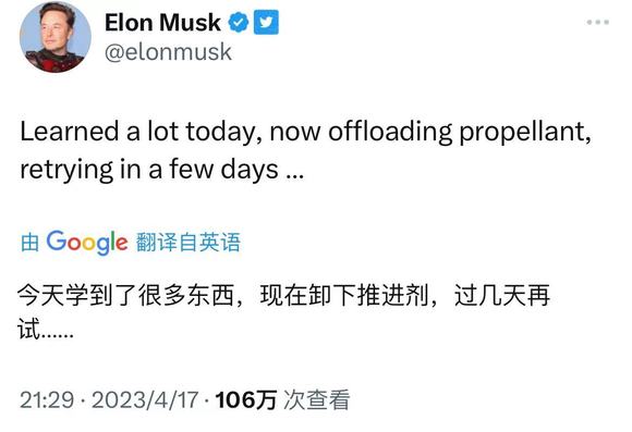 发射中止后,马斯克的推特更新,“今天学到了很多,现在卸下推进器,过几天再试。”