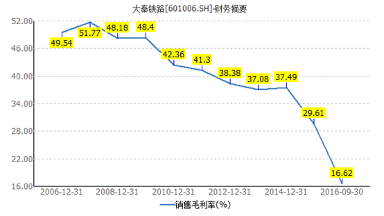 大秦铁路往年的日子较为风光。在2006年、2007年公司刚上市的两年,公司销售毛利率高达50%左右,从2010年起下滑至40%附近,2014年尚能维持在37%的水平,到2015年便跌破30%至29.61%。