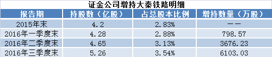 从大秦铁路今年的一季报、中报和三季报可以看出,证金公司连续三个季度对公司进行增持。证金公司的持股比例也由2015年年底的2.83%(4.2亿股),上升至2016年三季度末的3.54%(5.26亿股)。