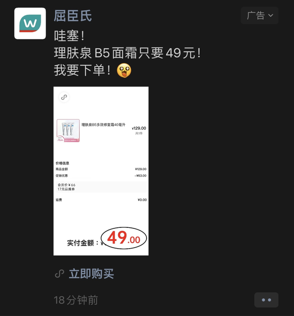 巧合的是,当天就在朋友圈刷到了屈臣氏的广告。这么多年过去了,屈臣氏的营销还是只会用打折、满减来吸引人。