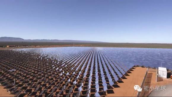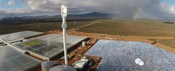 看看这整整齐齐排列的2.3万个镜子,这就是落日农场太阳能的主要来源。它们会向一个115米高的接收塔反射日光。天气晴朗时,一天能够产生3900万瓦特的能量,足以支持驱动海水淡化设备以及农场温室等所需要的电能。