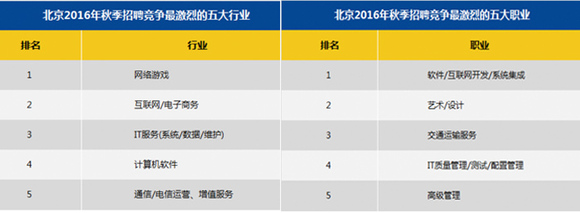 智联招聘2016年秋季在线数据显示,网络游戏行业的竞争指数最高,其次是互联网/电子商务行业,IT服务(系统/数据/维护)和计算机软件行业分别位列第三与第四位。通信/电信运营、增值服务行业的竞争指数排在第五名。竞争最为激烈的职业是软件/互联网开发/系统集成、艺术/设计和交通运输服务。此外,IT质量管理/测试/配置管理和高级管理的竞争也较为激烈。
