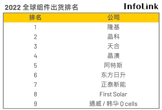 华夏能源网(公众号hxny3060)获悉,4月17日,Infolink发布2022年全球组件出货排名。
