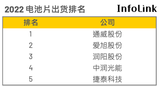 据数据统计,2022年电池片出货排名仍旧以通威股份(SH:600438)、爱旭股份(SH:600732)和润阳股份维持前三名的龙头地位,接续排名对比2021年则有些许变化,中润光能规划的扩产陆续上线后在2022上半年出货量爬升至第四名,捷泰也在本次榜单中重回前五名。