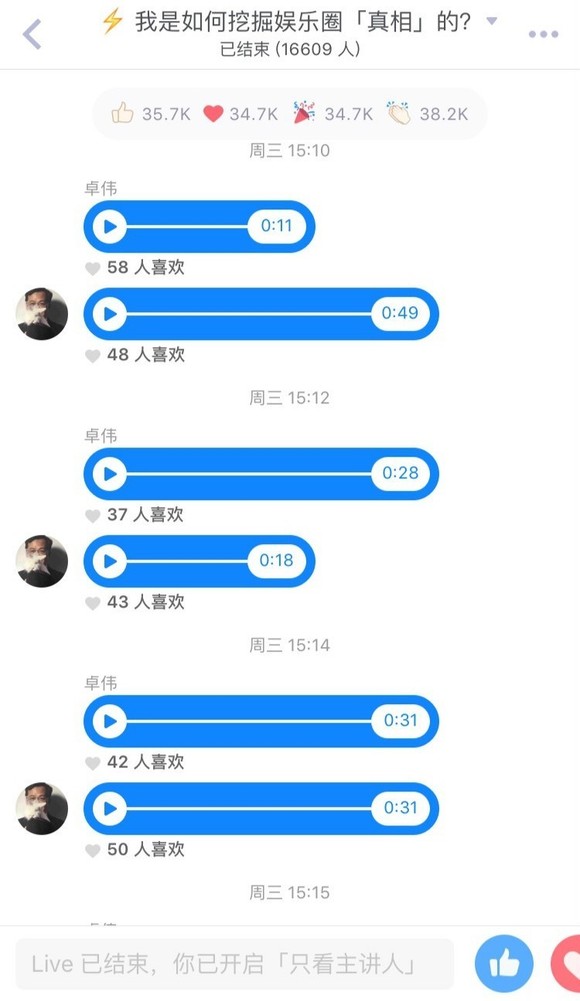 以往知乎都是邀请一些专业领域的先锋者与用户分享经验,但相比较而言,娱乐圈的新闻扩散的最为迅速和有效,更能有力地带动知乎Live的推广和宣传。于是这次他们找到了一个特别来宾——卓伟,一位曾经爆料过多位明星出轨的八卦新闻工作者。