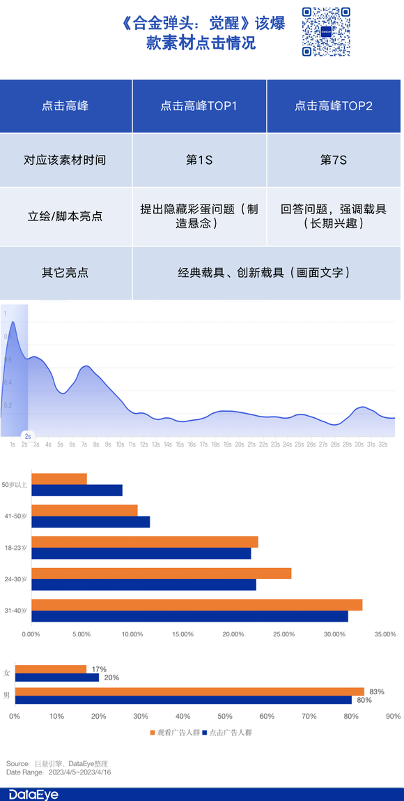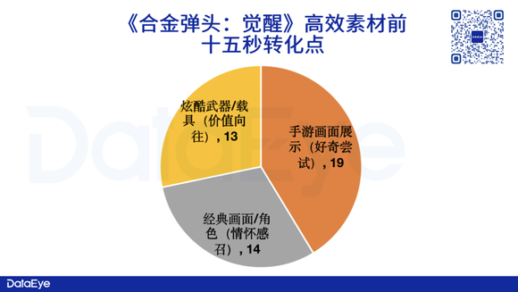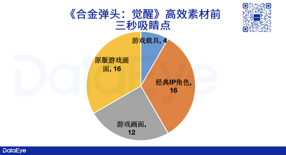 DataEye研究院梳理了《合金弹头:觉醒》2023年以来(截至4月19号),高效视频素材TOP30前三秒吸睛点。数据显示,“原版游戏画面”、“经典IP角色”占比较高,其次则是“手游画面展示”。