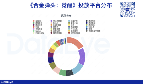 DataEye-ADX数据显示,截至4月19号,《合金弹头:觉醒》投放媒体渠道TOP5分别为:QQ音乐、穿山甲联盟、优量广告、腾讯视频以及酷我音乐。其中QQ音乐占比约为18%,位居第一。