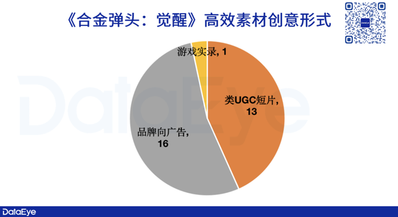 2023年来(截至4月19号)高效TOP30视频素材中,《合金弹头:觉醒》的高效素材主要以“品牌向广告”为主要创意形式包装素材,占比超过50%。