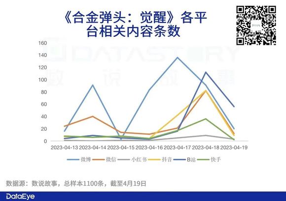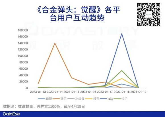数据显示:在内容条数方面,2023年4月13日-19日,共计1100条样本中,微博、微信总数量居前。而在用户互动量方面,共计131万样本中微信的总互动量较高,但B站在上线当天的用户互动量较为突出。