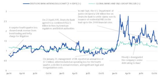 根据报告:“自从2008年6月以来,德银资产市值已经从2.3万亿跌至1.5万亿,跌幅大约35%,非常接近当前的违约点1.4万亿美元。自始以来,当一个公司的资产市值跌破违约点,那么这家公司将很有可能无法抛售资产或筹集额外资本以支付其债权人。”