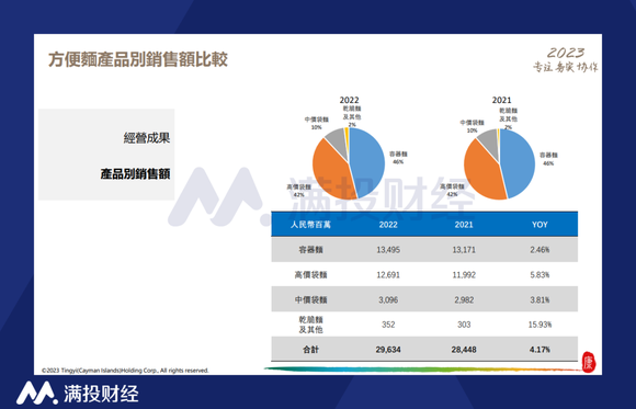 为了应对生产原料上涨的压力,康师傅不得不采取提价措施。从2021年开始康师傅就陆续对部分方便面产品进行提价,其中康师傅经典袋面提价12%,经典桶面提价12.5%。一定程度上提升了方便面业务的销量,公司方便面业务2022年营业销售额同比增长4.17%,然而从利润端来说,涨价并未能起到预想中的效果。