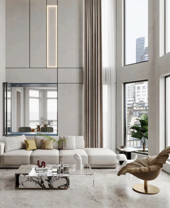 此次冠珠还联合了多名设计师,在现场推出运用华珍岩板的大宅设计案例,有位于上海的意式轻奢风复式居所,以及位于苏州500平方米的现代简约风独栋别墅。