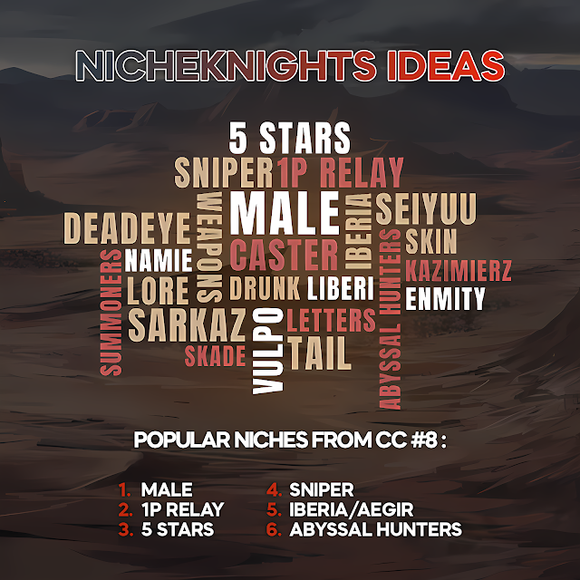 Nicheknights是他们对于给自己施加限制的玩法总称,比如用纯狙击过关,纯重装过关,纯先锋等等。这个词虽然是他们自己想到的,但随着他们在EN社区的影响力增大,攻略组也从原先的10人增长到了50人,所以Nicheknights已经是EN社区里面的专用术语了。