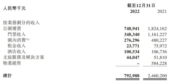 具体来看,其中公园运营业务中的门票收入由上一年度的11.61亿元锐减70%降至3.48亿元,园内消费也减少了43%降至2.76亿元,租金收入则减少了69%降至2377.1万元。