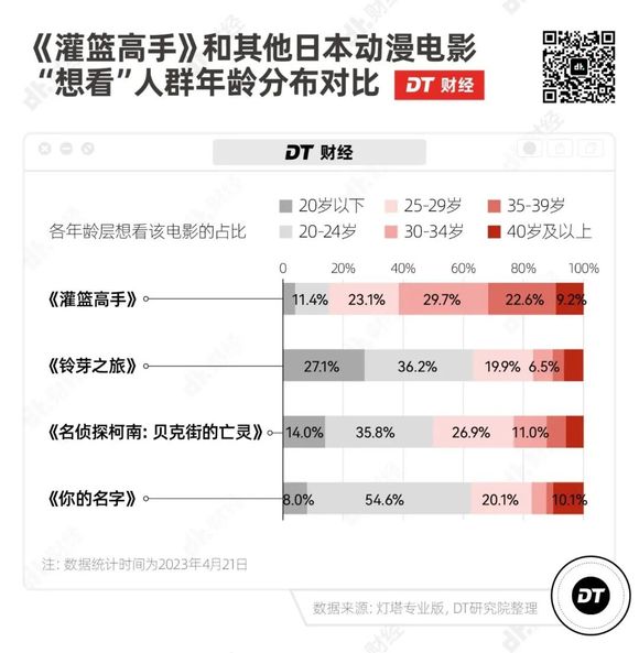 DT财经对比《灌篮高手》和其他几部日本动漫电影的“想看”人群,发现《你的名字》《铃芽之旅》《名侦探柯南》的主要受众还是25岁以下的年轻人,但“想看”《灌篮高手》的人中,30岁-39岁的比例达到了52.3%,明显高于其他电影。