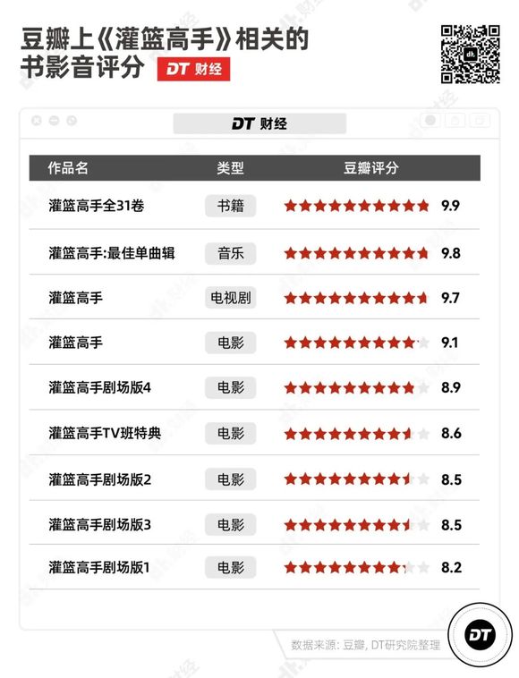 2013年,《灌篮高手》动画重制高清修复版,优酷、PPS等视频网站评分均在9分以上。到今天,《灌篮高手》的书、影、音都在豆瓣上有较高的评分。