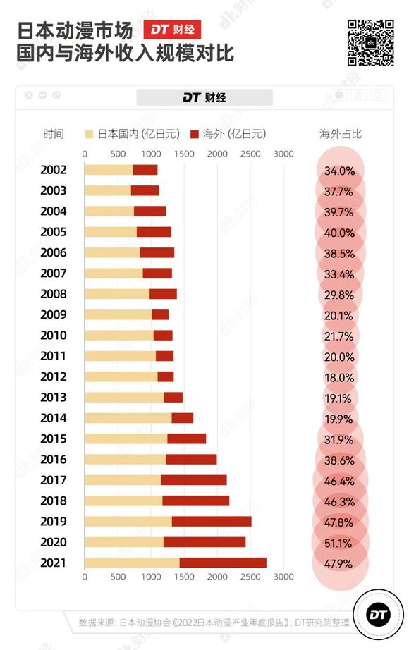 但网络限令随之而来,2006年,中国出台限制外国动画播放的政策。尽管2010年,内地电影市场开放,柯南剧场版系列开始进入电影院,让日本动画公司看到了新路线——没法在电视上播放,就到电影上。但都票房平平。日本动画协会发布的《2022日本动漫产业年度报告》显示,日本动漫市场海外收入从这一年开始下跌,一直到2016年,《你的名字》大火,才重新掀起新一轮日本动画大热潮。