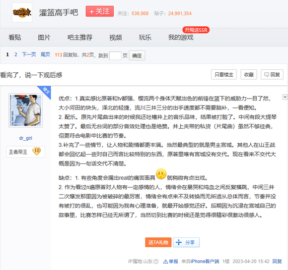 时至今日,百度贴吧“灌篮高手吧”还在活跃,在电影上映之后,这些“潜伏”在百度贴吧里多年、当年蹲守在电视机前的人,还是会去电影院看首映,然后再回到这个圈子发表观后感。