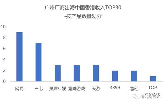 从产品数量来看,网易和三七互娱是广州游戏厂商出海中国香港的主力军,两大厂商合计包揽超半数的产品,灵犀互娱、露珠游戏和天游各有3款产品入围。