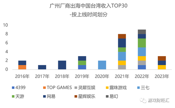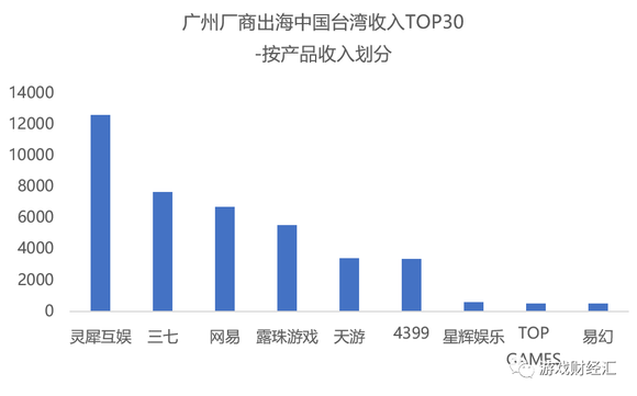 游戏财经汇统计了今年以来(截至4月17日)广州游戏厂商出海中国台湾收入排名前30的产品,30款产品来自9家广州厂商。跟出海中国香港相比,入围厂商多了星辉娱乐。
