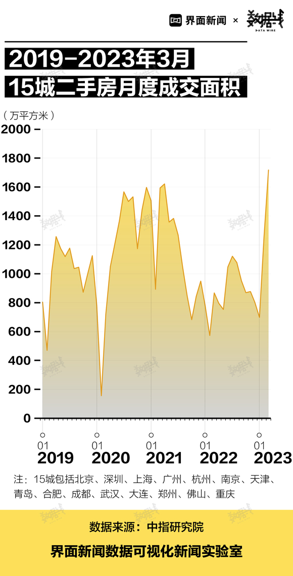 据中指研究院数据,2023年3月,15城二手房月度成交面积为1718.4万平方米,为近4年多来的最高水平,相当于2019年1月成交面积的两倍多。