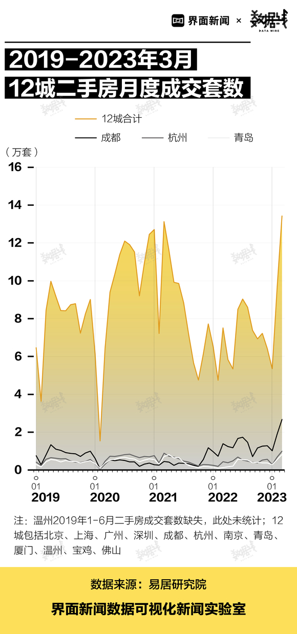 另据易居研究院数据,2023年3月,12城二手房月度成交套数为13.4万套,为2019年1月以来最高值,4年多来上涨约108%。从具体城市来看,3月成都、杭州、青岛等二线城市二手房单月成交套数创4年来新高,尤其是成都,3月成交套数约2.7万套,相当于4年前的3.5倍。